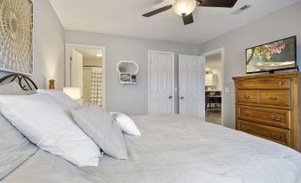 Main bedroom has a king sized bed with en suite bathroom with dual vanity and shower/tub combo.