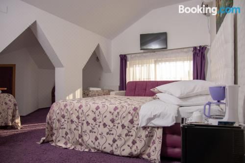 L’hotel è comodo da raggiungere dall’aeroporto di Otopeni, il personale fa di tutto per essere gentile e per chiederti se hai bisogno di qualcosa. Non ne posso parlar male, anche se la camera non mi è piaciuta, con un arredamento color viola e una moquettes assolutamente non di mio gradimento