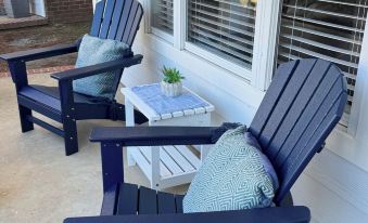 The living and dining areas feature gleaming hardwood floors and a 65-inch smart TV mounted above a gas fireplace, perfect for winding down after a day exploring Oxford. Our fully stocked kitchen includes Starbucks coffee, snacks, and condiments to get your mornings started right. A separate laundry room with washer and dryer adds to your convenience, while the covered front porch and spacious fenced rear patio offer peaceful spaces to sit back and relax.