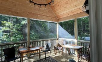 We booked this house in conjunction with visiting day at a nearby summer camp. A great decision! Sand Lake is perfect -- quiet, the perfect temperature for swimming, private, and pristinely clean. And the house itself is new and thoughtfully designed and equipped. The kitchen had everything we needed and the house was furnished comfortably, with care and taste. Best of all: the spacious screened-in porch where we could relax, dine, and converse without fear of bug bites. Our whole family enjoyed swimming off the new and modern dock and swimming float, and getting out on the lake in the provided canoe and kayaks (complete with life jackets of various sizes). One caveat: the shoreline is rocky and drops off rapidly, perhaps making it not the best for families with babies or toddlers. But the 4-year-old in our party had a blast bobbing around in her floaties. The homeowner was instantly and cheerfully responsive to questions that came up during our stay.