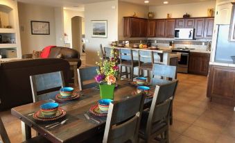This 2,600-square-foot home sits on 1/2 an acre, offering ample space for relaxation and enjoyment. Inside, you’ll find high-quality furnishings, premium appliances, and pillow-top beds for ultimate comfort. The fully stocked kitchen features stainless steel appliances—including a refrigerator, dishwasher, microwave, oven, trash compactor, and wine fridge—as well as everything you need to prepare meals, from a blender and wok to spices. The kitchen bar seats five, and the adjacent great room offers a dining table that seats six, along with two comfortable couches. Relax with a show on the 58” SMART TV with Dish Network or use the free WiFi to stream your favorites on Netflix or Hulu.
