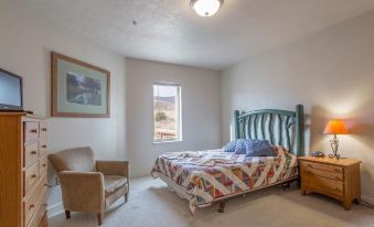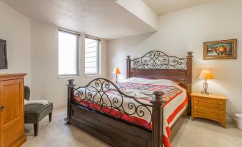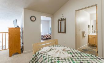 This unit has plenty of space to accommodate large families or groups and all the conveniences of home! The spacious master bedroom features a king-size bed and en-suite bathroom. The second bedroom includes a queen-size bed and the loft has three twin-size beds. This unit also has two and a half bathrooms as well as a pull out sofa bed. Relax in the spacious living room by the light of the fireplace or sit outside on your private deck and take in the breathtaking mountain views. The kitchen has everything you’ll need to cook up delicious meals and our large dining area with seating for eight is perfect for bringing everyone together. And with a washer and dryer in the unit you can pack light and leave room in your suitcase for purchases from the Park City (Tanger) Outlets right across the street!