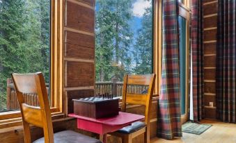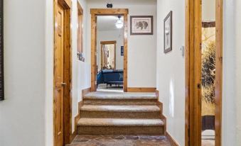 The massive great room has it all: the classic Colorado elk antler chandelier, the mossy stone fireplace, comfy seating, giant picture windows from floor to ceiling, and a large family dinner table. Enjoy the collection of DVDs on the 65" smart TV or just log in to your favorite streaming account. There are also plenty of board games to go around.