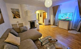 Cozy Living Area: The spacious living room is equipped with a comfortable sofa, a modern TV, and atmospheric lighting. Here, you can spend relaxed evenings or unwind after an exciting day.