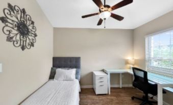 Fourth bedroom has twin bed with large desk for dedicated work space.