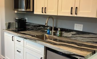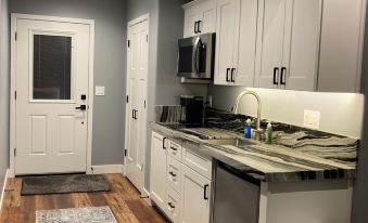 Kitchen is stocked with an induction cooktop, fridge with freezer, microwave, Keurig coffee maker, basic cooking pans and utensils, dinnerware and dining utensils. Queen bed, linens provided. Luxurious bathroom with electric heater and a spacious shower with rain style showerhead. Towels provided. Black out curtains on all windows and a large back porch for relaxing.About pets:No pets allowed, service animals permitted.About children:Children allowed: ages 0-17.About smoking:Smoking is not permitted.About events:No events allowed.