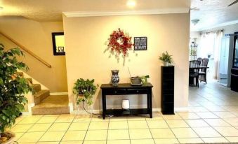 Inside, our home boasts a bouldering rock wall, adding a touch of rustic fun to the interior spaces. It also comes equipped with several full bookshelves, a game closet for hours of entertainment, as well as toys for little children while you're traveling, and a backyard playground.