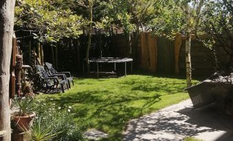 Garden with many trees and birds, terrace, BBQ and trampoline for children.