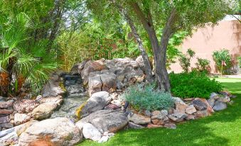 The expansive backyard is rich with mesquite and palm trees that provide plenty of shade year round and a full-size tennis court equipped with overhead lighting for night matches. The lagoon/river-style pool wraps around to an alcove between the living area and the master bedroom.
