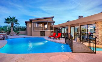 This resort-style home is designed around outdoor activities including a lazy river swimming pool, 3-tier putting and pitching greens, tennis, bocci, Basketball, pickleball, BBQ, outdoor dining, numerous yard games and much more! The huge sliding glass wall opens from the kitchen and dining areas onto a majestic resort of activities featuring beautiful mountain views. This home is for larger groups that want to have lots of fun! If you are looking for a fun Arizona indoor-outdoor stay this is the property for you. Great Location, Central to everything in Phoenix/Scottsdale