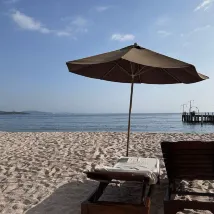 The beach and the tranquility are definitely a plus. The beach is nothing extraordinary but it is ideal if you just want to relax and enjoy "farniente". However there long chairs are far from comfortable. Plain hard and heavy wood (or good imitation) with nothing on top to soften the contact ;-)