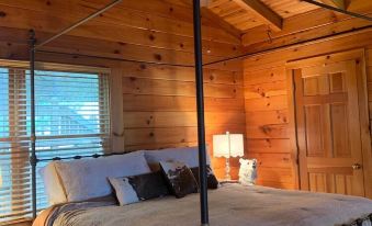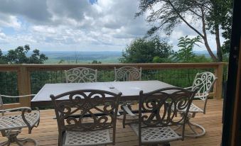 The main floor features all original wood construction with 2 Bedrooms w/queen beds and one full Bathroom. The main floor is a full open concept Living Room, Dining Room and Kitchen with sliding doors to access the main deck. Dining room has a custom wood dining table with 8-person seating and the Kitchen is equipped with all appliances including air fryer, coffee maker, Keurig, toaster, and everything needed for cooking and dining. The main floor exterior deck offers picturesque views high above the trees (Autumn colors are awesome!) with an outdoor 6-person dining table, two relaxing lounge chairs, gas grill and a wood bar w/seating for two to enjoy your morning coffee or evening wine. The morning and evening views are amazing and often include wild deer and turkey walking by, and the occasional bear! The main floor also includes a screened in porch with 4-person dining table.