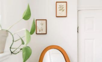 Head upstairs to the second floor to find the bathroom and two uniquely curated bedrooms. Amenities like cotton balls, tampons, and a hairdryer are provided.