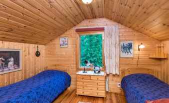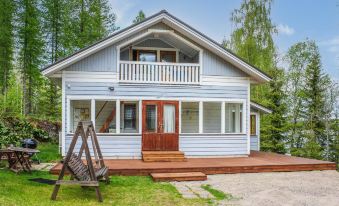 Wooden cottage 1995, living room with kitchen, bedroom 2 beds, upstairs bedroom 2 beds, upstairs "lounge room" extra double bed (bed width 140 cm), sauna, 2 glazed terraces (20 m² and 14 m²). Toilet is in the hallway of sauna, curtain can drawn in front of toilet (see picture). Patio.