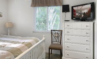 The owners suite offers a king size bed, plenty of closet space and a full bathroom. The guest room offers a queen size bed, closet space and a Roku TV.