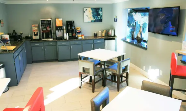 Complimentary amenities include our well appointed on-site fitness room business center free light breakfast local calls HBO and ESPN. Laundry facilities are also conveniently available on-site. Property does not have an elevator.