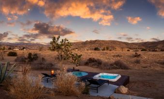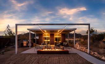 Steel & Solace By the property manager is an iconic modern home offering sweeping desert vistas and premium amenities. Step onto the shaded patio with fire pit, BBQ station, pizza oven, and cozy seating, perfect for morning coffee. Dip in the pool or hot tub, play bocce and horseshoes, and meditate on the yoga deck. Stroll to Pappy’s or Red Dog Saloon. Then unwind in the private courtyard with soaking tub, fire bowl, zen garden, and outdoor shower for a spa-inspired experience.
