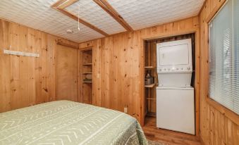 The kitchen, dining, and living areas share an open-concept layout with vaulted ceilings and a stunning view of Loon Lake. The living area includes a 42" TV with a Fire Stick, Blu-ray player, and a collection of movies—perfect for relaxing after a day outdoors. The couch folds down into a full-size bed to accommodate an additional guest.