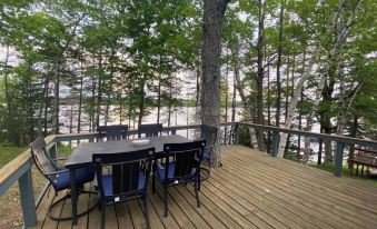 At the back of the cottage, a deck overlooks beautiful Loon Lake and offers seating for six at an outdoor dining table—perfect for meals with a view, evening sunsets, or simply relaxing and soaking in the peaceful lakeside atmosphere.