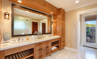 The primary bedroom features a king bed, en-suite bathroom with deep soaking tub, indoor shower, lighted double vanity and a pass through to a private lava rock outdoor shower. The second bedroom has a king bed, vanity and indoor shower. The third bedroom has two twin beds that can be converted into a king bed for maximum flexibility.