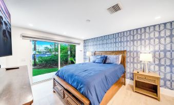The property features five beautifully appointed bedrooms and 4 1/2 bathrooms. The first bedroom is a serene oasis with a queen platform bed, complete with storage drawers for convenience. It also includes nightstands, ample closet space, a mini fridge, and a smart TV for entertainment. The attached walk-in bathroom boasts a modern shower, and the room offers breathtaking water views and direct access to the backyard and pool deck, making it a perfect spot to unwind.