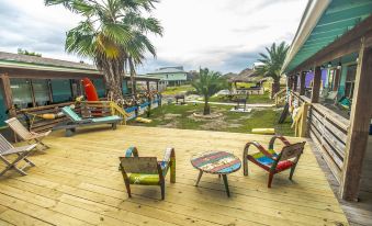 The cabins are all connected by a large porch which faces the back of the property towards the beach. This porch and the outdoor space is shared by all property guests. Almost always you can sit out and enjoy the ocean breeze. There is lots of room for kids and adults to run and play out back away from the road. We also have a few games outside that you are welcome to use. We have an outdoor cooking area with gas or charcoal grills. This is a really great place to cook out and have your friends or family enjoy with you as there is lots of seating.