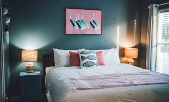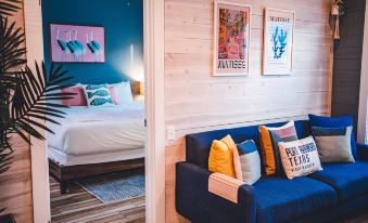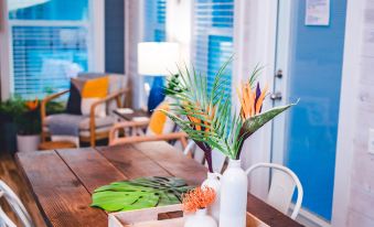 Good Vibes & Tides is a beautifully decorated 4-bedroom home in a gated community within walking distance to one of the shared pools in the complex, which is heated during the winter months. The large open living area has ample seating with a comfy couch, plush pillows, matching accent chairs, a wall-mounted TV, cable, and Wi-Fi. The full kitchen will meet your culinary needs equipped with plenty of counter space and stainless-steel appliances, dishes, basic pots, pans, utensils, coffee maker (dual drip and pod), toaster, and blender. Gather at the dining table with seating for 8 and additional stools for 3 at the breakfast bar. There is a half bath to serve the bottom floor. The downstairs master bedroom (BR1) is just off of the living area, comprised of a King size bed, wall-mounted TV, luggage rack and an ensuite bathroom with a stand-alone tile shower. Enjoy your morning cup of coffee while sitting out back on the veranda. The garage has been converted into a game room, a great space to gather family and friends for competitive games of foosball, cornhole, darts and for watching your favorite sport on TV. This area also offers use of the full-size stackable washer and dryer, iron, ironing board, cleaning accessories. Feel free to use chairs, coolers and bicycles when headed to the beach. Venture upstairs and you will find another master bedroom (BR2) which provides a Queen size bed, chest for your beach attire, a wall-mounted TV, luggage rack and an ensuite bathroom with a large tile shower. The guest bedroom (BR3) contains two Full-size beds, a wall-mounted TV. Kids will love the bunk room (BR4) outfitted with 2 sets of Twin over Twin bunk beds, a wall-mounted TV and floor space to play. These two bedrooms share a Jack & Jill style bathroom with a shower. More entertainment can be found in the backyard, which features a miniature putting green, two separate outdoor seating areas and a charcoal grill for cooking up the day's catch. There is parking for 3 in the driveway, strictly enforced with parking passes. Village Walk is a short 4-minute ride to the beach by car or golf cart.