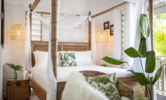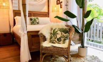 1 king bedroom with ensuite, air conditioned, ceiling fan, fitted wardrobes, opening French doors to a private balcony, colonial style with tropical furniture and views to the pool and nature.