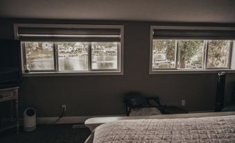 This four-bedroom, three-bathroom home includes a stunning luxury master suite with panoramic lake views, a plush adjustable king bed, and a spa-like en-suite bathroom featuring a rain shower and double vanity for the ultimate stay. Two additional bedrooms on the main floor include a queen size and full-size bed and share a beautifully updated Jack and Jill bathroom with a tiled shower. The lower level offers a fourth bedroom with a twin bed just off another fully updated full bathroom, providing ample space for families or groups.