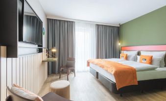 Stay in one of 270 tech-savvy rooms featuring high-speed WiFi, smart TVs, and Bluetooth speakers. Some premium rooms offer kitchenettes—perfect for extended stays in Potsdam. Begin your day with a hearty breakfast buffet, then unwind in our relaxing sauna or enjoy the vibrant Living Lobby with co-working spaces, board games, and a lively bar open until midnight.