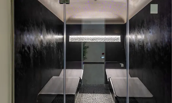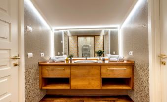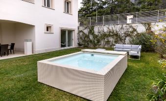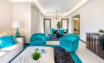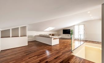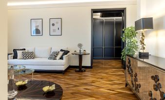 The main entrance leads to a spacious and elegant living room with an adjoining library featuring both cooling and heating underfloor systems, adorned with designer furniture and accessories, and an exclusive parquet floor. From here, through a hallway, one can access an independent white marble bathroom and the first double bedroom, comprising a 1.60m bed and a very spacious and refined closet with LED sensor lights.