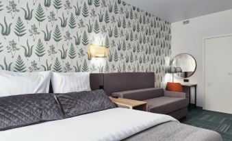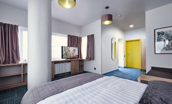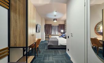 The interior of the hotel combines bright colors and textures, creating a cozy atmosphere inside the common areas and rooms. The interior design of the hotel is designed in a cheerful and eclectic style with a touch of Art Deco. Thanks to upholstered furniture, embossed carpet, wallpaper ornaments, round mirrors, original table lamps emitting warm light, a special atmosphere of convenience and comfort is created. Guests can stay in Standard and Comfort rooms. The rooms have a bed, wardrobe, mirror, TV, armchair, bedside table, private bathroom with shower.
