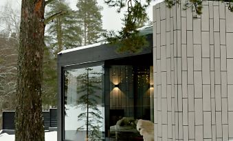 EDER Vuoksa Hotel is located in the village of Melnikovo on the rocky shore of the Vuoksa River, 105 km from St. Petersburg. The panoramic windows of the cottages at the EDER Vuoksa Landscape Hotel offer an amazing view of the Vuoksa River, its expansive course. However, "how the river flows" can be contemplated even from bathrooms and saunas. The architecture of the buildings is such that their windows look even into the sky, and the soft light from them falls with extraordinary naturalness on the entire interior.