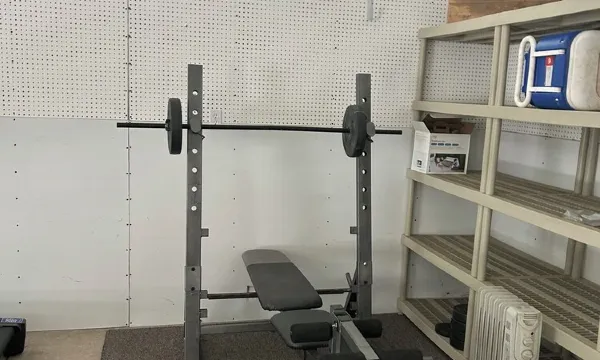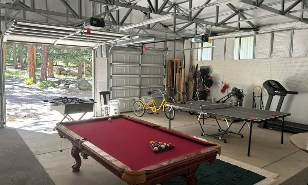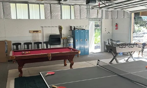 The recreation room is in the 2-car garage with a pool table, foosball, table tennis, darts, treadmill and weight bench. There is a small refrigerator in here as well.