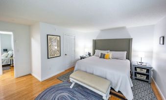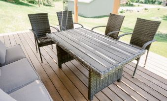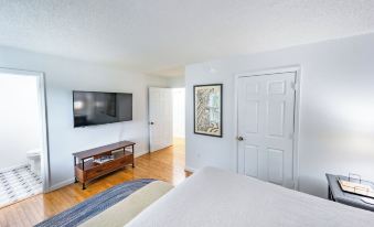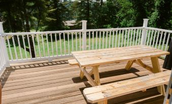 The upper level features a fully stocked, eat-in kitchen with a large farmhouse dining table. Walk out to the upper deck, with a propane grill and additional dining table. The main living area has a Roku TV and there is high speed internet throughout the house. On the main floor, the primary bedroom features a king bed with attached full bathroom with shower. There are two additional queen bedrooms and another full bath with tub/shower combination on the main floor.