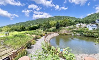 民宿位置也太好了吧,抬頭就能看到天柱峯,去大龍窩索道衹要開車五分鐘,門口還有小池塘和茶園可以散步遛彎