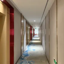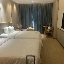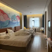 Pros: The front desk staff were exceptionally warm, polite, and thoughtful; they even provided a new ID card holder for free when mine was worn out. Complimentary fruit was provided, and children received a welcome souvenir. The room boasts a fully integrated smart home system, controlled by a device like Xiaodu, making it incredibly convenient for playing music and streaming movies/TV shows. Free TV access is also available. Furthermore, complimentary breakfast (featuring dozens of rich and nutritious Chinese and Western dishes) and late-night snacks are included. Robot delivery service brings takeout directly to the room. The hotel's surroundings are bustling with shops, making dining out and buying drinks very convenient. It's located just over 2 kilometers from Wanda Plaza and 4-5 kilometers from various attractions, approximately a 30-minute taxi ride away.