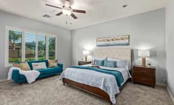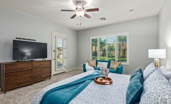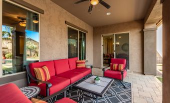 Step inside to an open concept dining, living and kitchen. The dining room is private and just off the kitchen. There is a wine fridge, giant walk in pantry and butlers area off the dining room for ease in serving. The kitchen is equipped with high end appliances, gorgeous granite counters and a massive island and breakfast bar, perfect for entertaining. The super spacious living room has comfy seating for everyone and has a TV you can see from anywhere in the open concept. Just off the entrance and living room is an office for working from home or just having a place to set up that laptop. Down the hall toward the rear of the house and split from the other bedrooms is the Master. King bed, reading area, tv and so much room to spread out. Super private with views to the mountains and resort backyard. The master bath has an enormous countertop with double sinks, a walk in shower and closet and a large soaking tub. There is also a private toilet room. Down the hall toward the front of the house are three other large bedrooms. All with walk in closets, queen beds and TV's for a private retreat for all. There is a large shared bath with double sinks, a tub shower combo and the vanity is separate so everyone can get ready. A third full bath is located near the butlers area with access to the backyard and has a walk in shower. There is a full, laundry room and super fast wifi throughout the home.