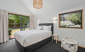 Configured over three levels, the master bedroom with ensuite is on the top floor, offering a king bed with beautiful mountain and lake views from a private balcony. Bedroom two on the mezzanine level offers a queen bed with equally gorgeous views. Bedroom three on the lower level offers a queen bed with garden views. A glass slider opening out onto a deck leading into the private garden.