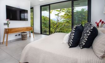 On the same level is the VIP master bedroom with en suite full bathroom and floor to ceiling windows with jungle and mountain views. Remote control blackout shades and air conditioning ensure a good rest after an exciting day on a fantastic tour or just relaxing at the beach. Relax to your favorite shows on netfix with 43” smart tvs in each bedroom.