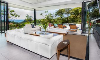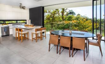 The first floor includes a gourmet kitchen, breakfast island, and open social area with dining, lounge area, and spectacular views of the jungle, wildlife and Pacific Ocean. A half bath serves the first-floor social area.