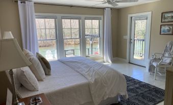 Located waterside on the jewell of the North Georgia lakes, this lakeside home was completely renovated in 2017 and features everything you're looking for in a lake vacation. Totally rebuilt and upgraded, this 4-bedroom, 3 1/2 bath home features all brand new amenities including a cook's kitchen with granite countertops, tasteful furnishings with designer fabrics, and two king bedroom suites. There are a total of 4 private bedrooms. The two king bedroom suites feature king size beds; the smaller bedrooms include queen size beds. The third story contains a large bonus room with giant smart tv, two built in beds and a queen size sleeper sofa. The room arrangements comfortable sleep 10-12 guests (e.g. 4 couples and 4 children).