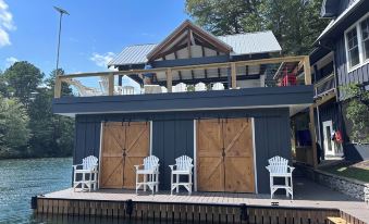 The 2-stall boathouse provides a kayak and paddle boards , as well as dock-side boat parking, and there is a public boat ramp just 2 minutes up the lake. If you wish to rent a pontoon boat (kayaks, paddle boards, canoes, etc.) we recommend Bear Gap Outfitters.com, which is located just minutes from the house. They will deliver your boat and provide a brief orientation on boat safety and navigating the lake. There is an extra large deck atop the boathouse with partial shaded coverage and a jump platform.