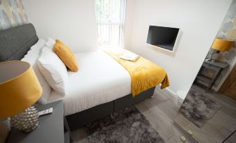 Visiting Reading for a family wedding, a house for up to 8 with 4 en-suite double bedrooms was just what we were looking for and good value when compared to hotel rooms, even those in budget chains! Booked through *********** and was non refundable with an additional £200 damage deposit taken close to occupation and returned very promptly after departure. Early check in and late checkout (up to 14.00, if available) for £10 per hour. Managed by a company and communication was straightforward. Be aware that you need to provide photo ID for each occupant at least 24 hours before check in. Once complete, the company supply the key code on the morning of arrival. In a quiet street just a 5 minute taxi ride from the train station. Taxis charged us between £6 and £13, so do your research! CAMRA rated pub, The Nags Head (with beer garden) just around the corner, M&S Simply Food, Tesco Express within a 5 minute walk. Lots of takeaways close by. One bedroom on the ground floor, a dining room, well equipped kitchen with washing machine, dryer, dishwasher, iron and board. No lounge but we were aware of this and managed using the dining room and the very pleasant and private furnished yard - we had good weather! I’d add some solar fairy lights in the yard for added atmosphere on a lovely summer evening. No smoking arrangement suited us, there is an ashtray outside for those who need it. Three double en-suites on the upper floor, all different sizes, one being spacious and one rather compact. All had small en-suites with different sized showers. All the beds, linen and towels were spotlessly clean. Toiletries and hair dryer in each room. The stairs are steep and would really benefit from a handrail although my sprightly 80 year old Mum managed perfectly well. I have mobility issues and so the ground floor room was good for me. Vertical blinds and curtains in the bedrooms. Windows were easy to open and there was a large fan in each room, great for the ground floor room especially, where you may not want to leave the window open overnight. There is a movement sensor operated light on the stairs, hall and landing, this was useful. WiFi worked well and each bedroom had a wall mounted TV. Well equipped kitchen with all the appliances, glasses, crockery and utensils you would need. Arrived to find milk, chilled water, tea, coffee, sugar and individual portion boxes of cereals. There is also washing up liquid, pods for the washing machine and tablets for the dishwasher. A quick trip to the local M&S and we were sorted for our weekend stay. We thoroughly enjoyed our stay in this lovely property and would recommend without hesitation.