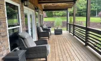 My three best girlfriends, their husbands and children all came to stay at this beautiful property for a week at the end of July beginning of August. It was exactly as described if not better and George the owner was incredibly helpful and communicative throughout the stay before, and after as well! He is just truly a gem. The property is beautiful – there’s a little creek man-made around the front of the house that my four-year-old would not stop playing in… We saw so many creatures in the wild! Rabbits, turkey, deer even a family of bears! It was really wonderful. I would recommend this property to anyone. There was enough space to where you didn’t feel like you were all on top of each other and also were able to hang out together comfortably. The back deck was wonderful. The huge yard was amazing!