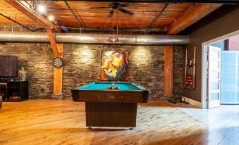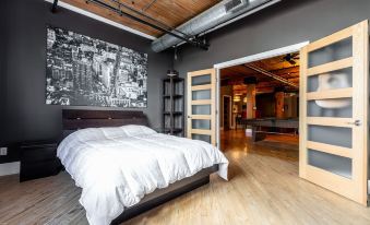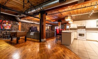 This spacious NYC style warehouse loft is centrally located downtown in Regina’s Warehouse District. This unique style of condo offers hardwood floors, original wood beams, exposed brick and incredible 10’ ceilings. In this condo you will find a pool table, foosball table, darts and a collection of board games for all your entertainment needs. If you’d rather kick back and relax this space has you covered, just fill the jacuzzi tub, turn on the fireplace and cozy up on the 25’ sectional!