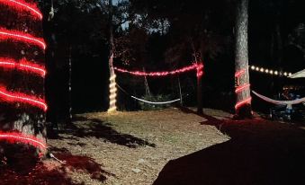 A tree platform, kayaks, a movie projector screen spot, and a couple fire pits.