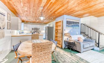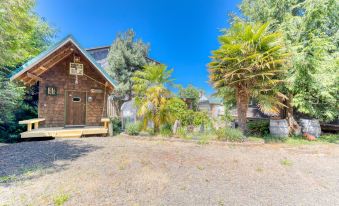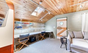 This inviting, custom home extends its living space with a covered downstairs deck for dining and an upstairs bedroom deck with a vaulted ceiling that encourages relaxation and contemplation. A huge yard gives you extra space and privacy. Inside, you’ll find attractive, cozy spaces under a golden plank ceiling that suffuses everything with warmth. Lean back in the living room recliners, cozy up to the wood stove if the evening gets chilly, and enjoy take-out from town at the dining table. If you prefer to cook, you’ll enjoy the stainless-steel appliances, wood countertops, handy island, gas range, and plentiful counter space. A sweet staircase takes you up to the large queen bedroom, with its extra sleeper sofa, TV, workspace, and deck.