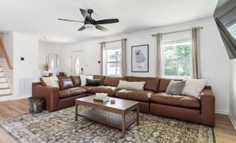 Heading inside on the main level is a large room with an open concept kitchen, dining, and living area. This space is perfect for cooking, entertaining, and enjoying your favorite show on the 75” 4K Smart TV. Relax from all the outdoor fun by getting comfy on the large leather sectional big enough to fit the whole crew.