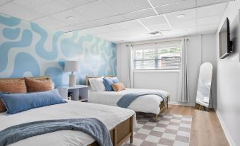 Heading to the lower level you will find the final bathroom & bedroom. The large bedroom features two queen beds and a custom hand-painted mural that will make you say, “wow”. Finally, on the lower level is the game room. Make memories playing the wall mounted scrabble, connect 4, or tic-tac-toe. The games continue with a small air hockey/ping pong table, an oversized Jenga set & a kiddie corner for the kids. Whether it’s a game night or movie night, make sure to enjoy the large commercial 8 oz popcorn popper. We provide 2 easy to use popcorn packets, on the house!